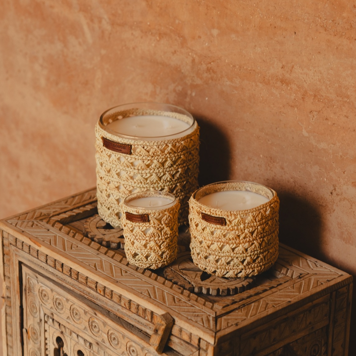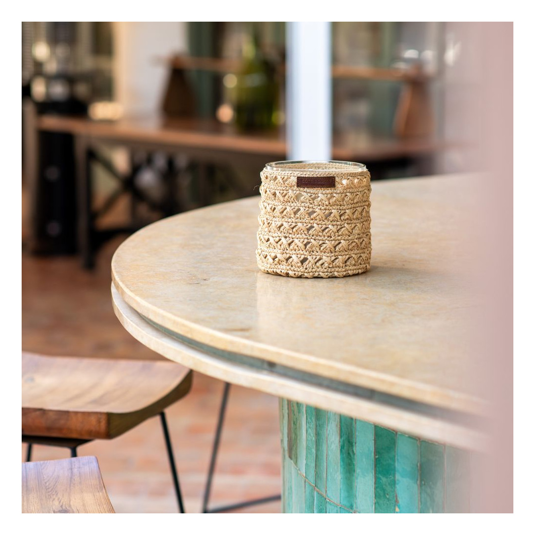 Die Duftkerzen aus der Kollektion Raphia verzaubern mit ihrem Design – umwickelt mit feinem, beigem Raffia und ergänzt durch ein dezentes Lederetikett, das den authentischen Charakter unterstreicht. Raffia ist ein Naturfaserstoff, gewonnen aus Palmblättern, den die Frauen in Essaouira sorgfältig reinigen, färben und zu feinen Mustern von Hand flechten. Jedes Detail ist so das Ergebnis ihrer Fertigkeit und Geduld und bringt ein Stück Marokko direkt in Ihr Zuhause.